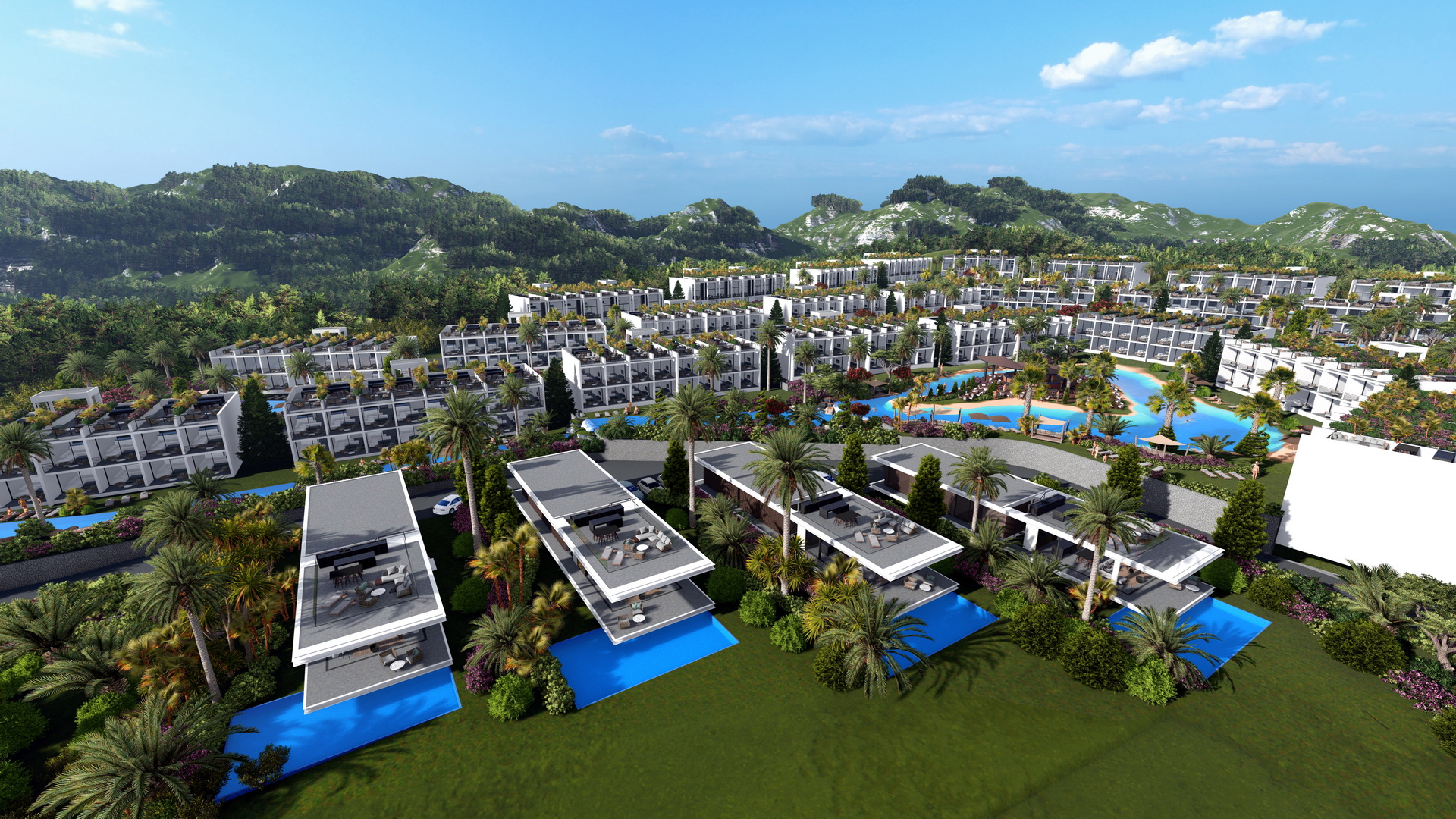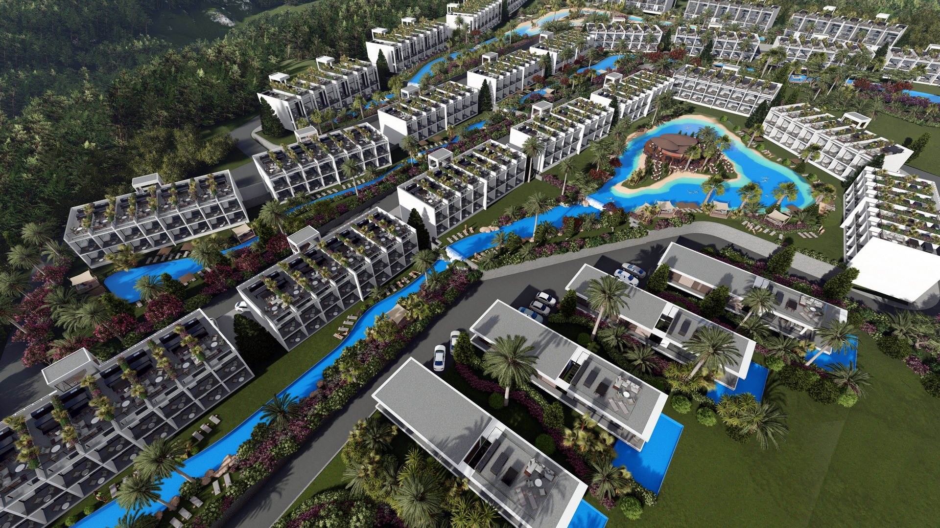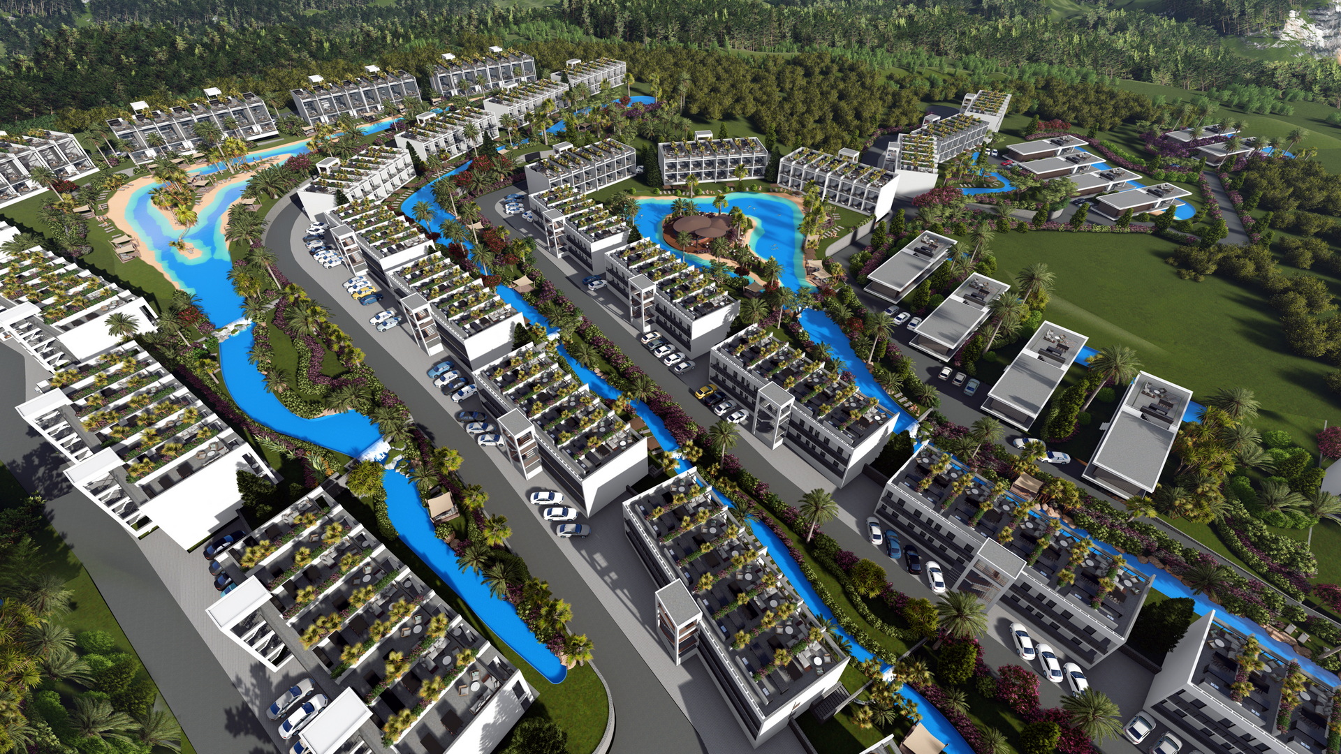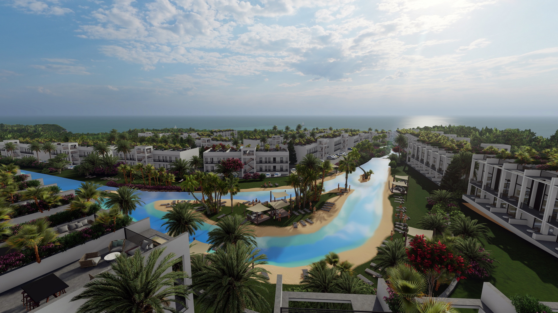 Hawaii Homes is a vast sea side residential project by Cyprus Constructions, featuring 500 units of different types including studios, 1+1 and 2+1 loft penthouses, and 3 bedroom luxury villas. The project is located on the coast of Tatlisu and covers an expansive area with artificial rivers, lakes, and islands along with beautiful garden designs. The facilities available on site include an indoor heated pool, spa center, restaurant, bar, gym, basketball and tennis court. The project is expected to be completed by the end of 2025.