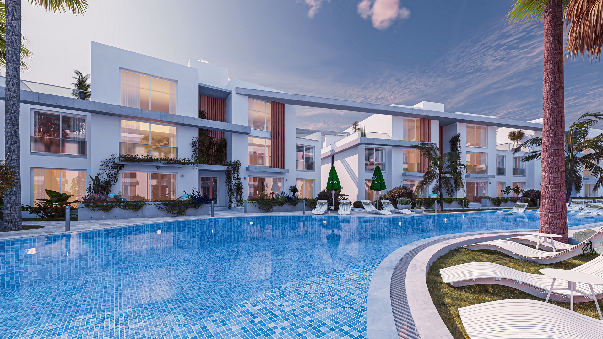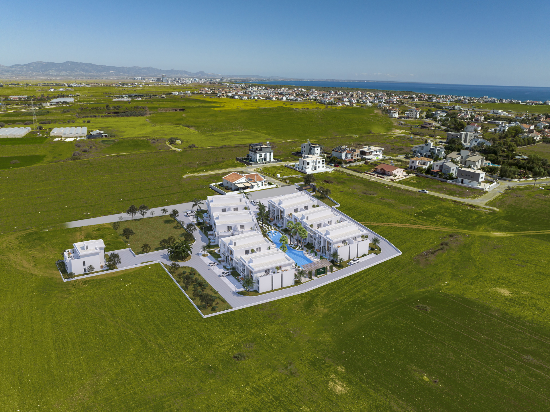 Olive Court Project is perfectly situated to embrace the Mediterranean. Yeniboğaziçi was developed on an uneven terrain that is closely connected to Salamis forests. The project's concept is unique and consistently emphasizes the natural spirit. The project will accommodate diverse lifestyles and is seen as a large-scale intervention. To ensure continuity and cohesion, architectural masses were connected to each other in horizontal platforms. Long pools and green areas were also designed horizontally to connect all aspects of life. The project's new and ambitious approach to Mediterranean architecture has skillfully incorporated the principles of privacy and socialization, while also accommodating all regional and environmental values in meticulous detail.