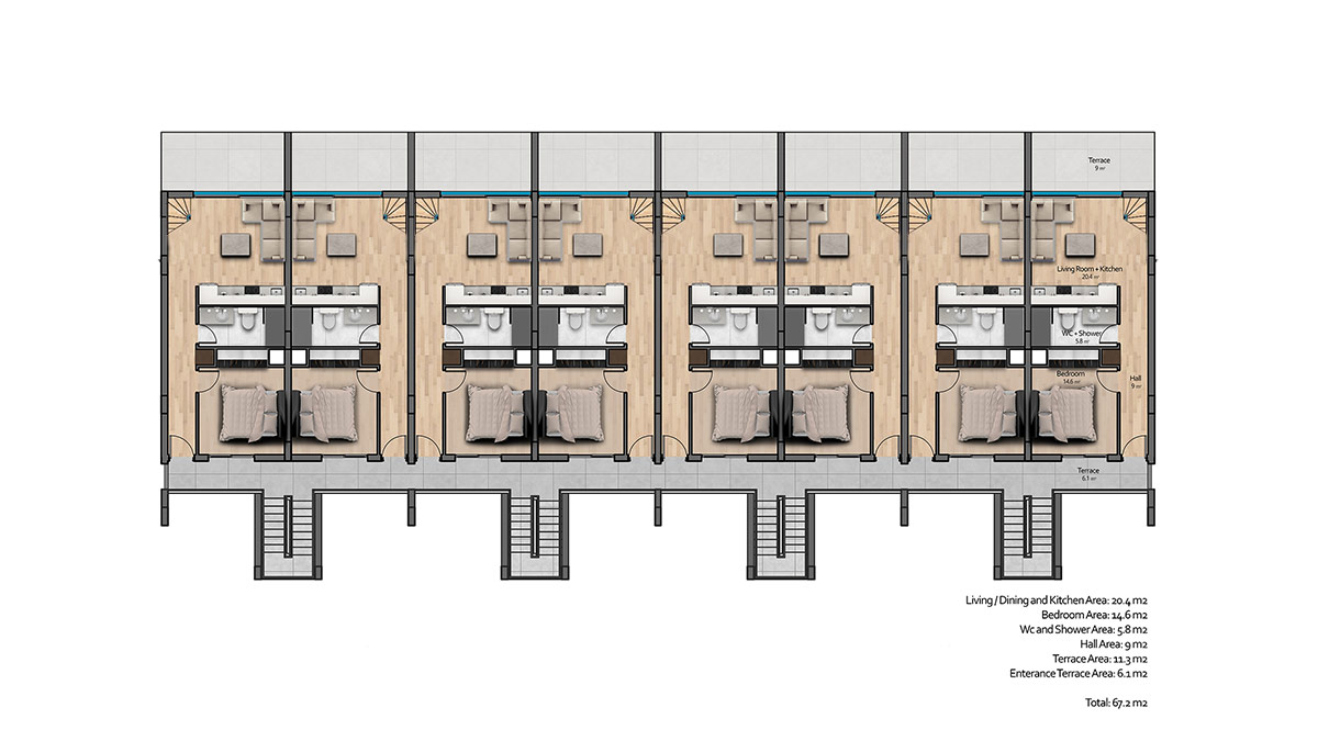 These spacious 2+1 loft apartments are located in close proximity to the sea and are the perfect choice for those seeking a luxurious and comfortable lifestyle. The apartment consists of a spacious living room, fully equipped kitchen, and two bedrooms, with a total area of 75m². In addition to this, the apartment also has a beautiful terrace of 10m², as well as a huge private rooftop terrace where you can enjoy the picturesque views of the sea, surrounding nature, and the sunshine. The total area of this magnificent property is 135m². The 2+1 loft apartments offer an impeccable combination of coziness, comfort, and elegance for true connoisseurs of beautiful life by the sea.