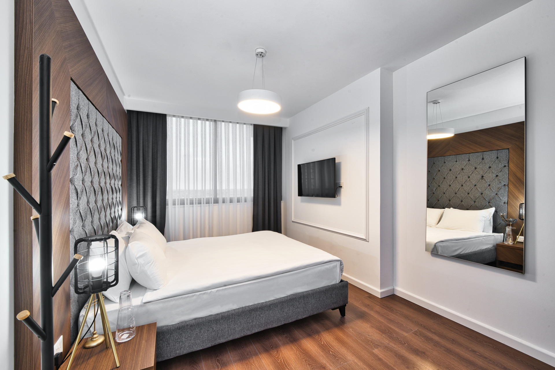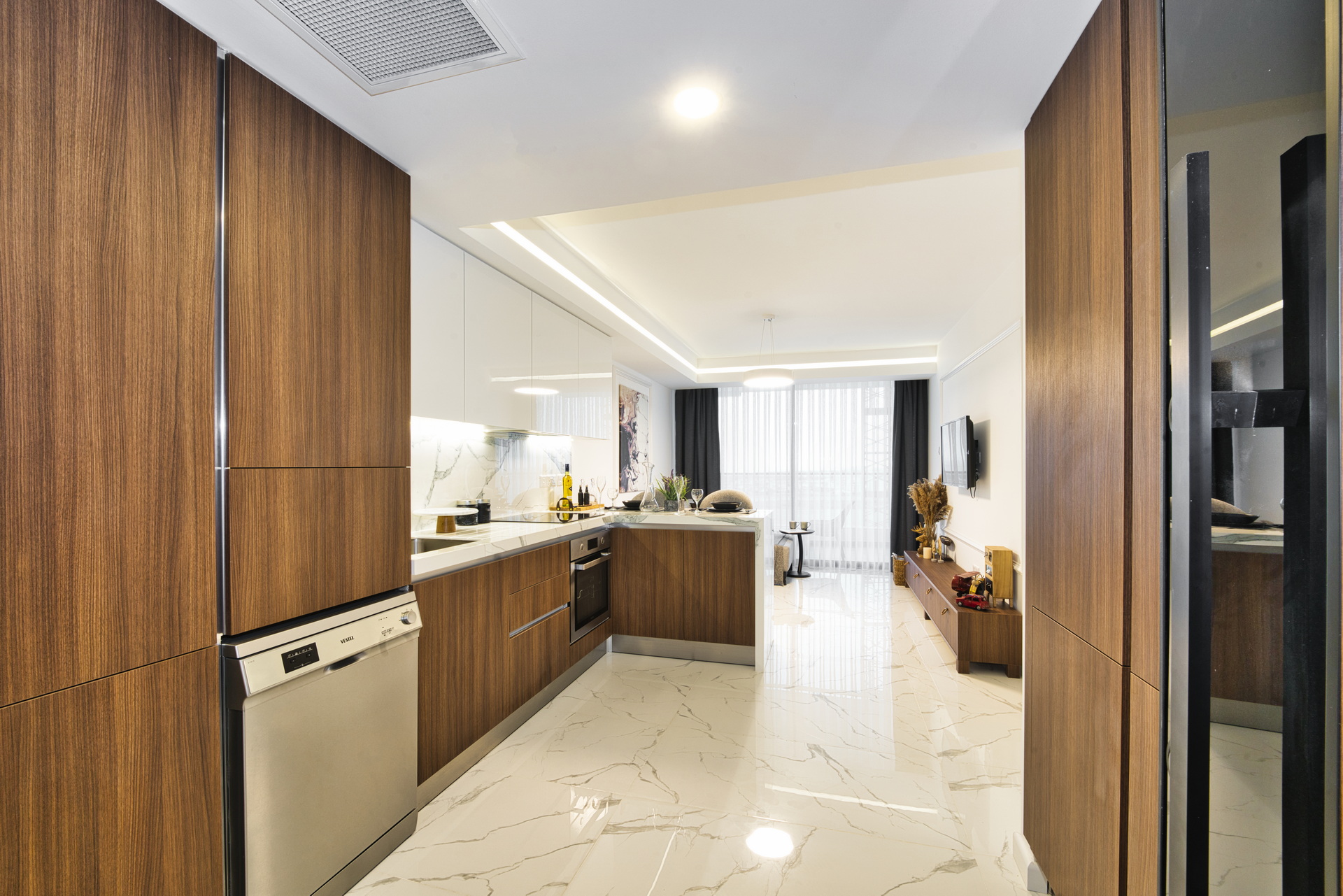 The apartment also includes built-in wardrobes in the hallway and bedroom, a mirror, curtains, and various kitchen appliances such as a toaster, coffee maker, kettle, iron, ironing board, and a complete set of dishware and cutlery. There are also two TVs from VESTEL, a refrigerator, washing machine, dish washer, cooker hood, built-in oven, electric stove, and microwave.
