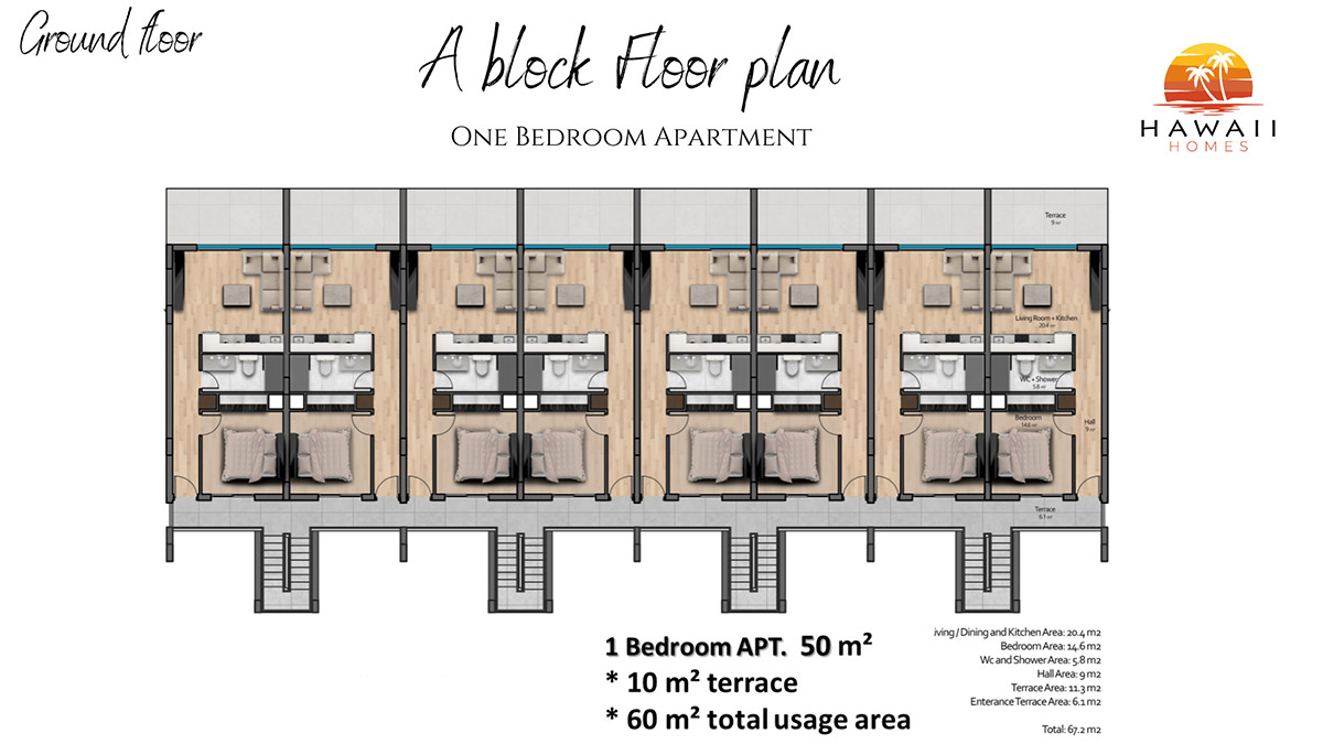 Imagine a cozy apartment on the seafront, located in the luxurious residential complex of Hawaii Homes. In these beautiful 1+1 type apartments, you will find a spacious living room with a kitchen, as well as a comfortable bedroom, with a total area of 50 square meters. And if you want to enjoy the fresh sea air, you will be pleased with the cozy terrace, which is 10 square meters in size. Summing up all the advantages of this residential property, we can talk about a total area of 60 square meters - a wonderful place to live by the sea!