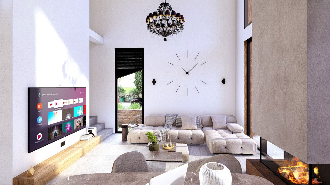 High ceilings, panoramic windows, a wood-burning fireplace, and the presence of a private land plot make this villa truly unique.