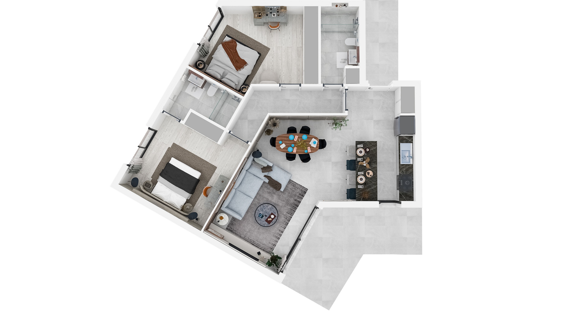 The apartments are equipped with everything you need for a comfortable stay: two bedrooms, a bathroom and a spacious living room with an open kitchen. The interior is designed in a modern style and complemented by high-quality furniture.
