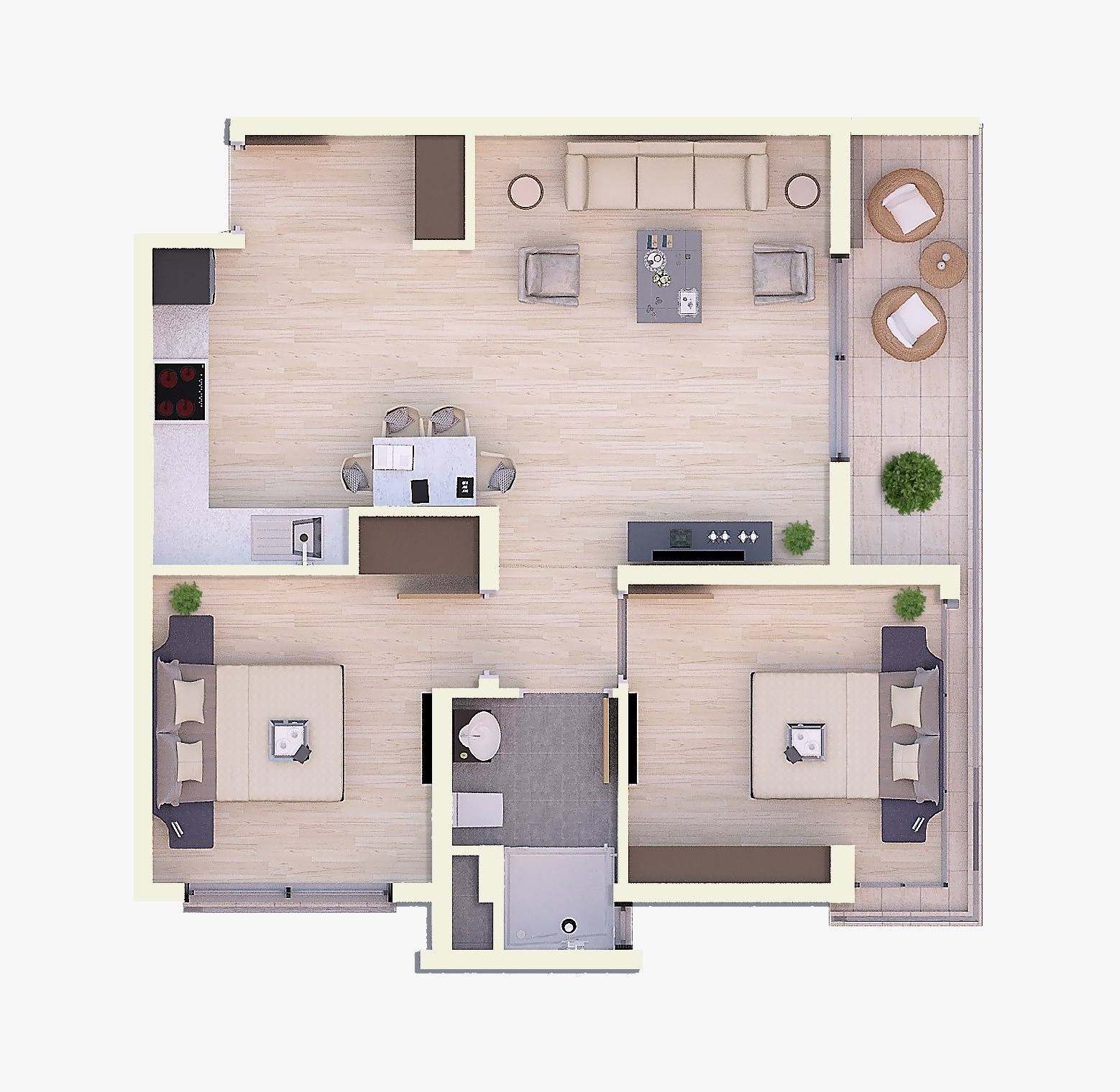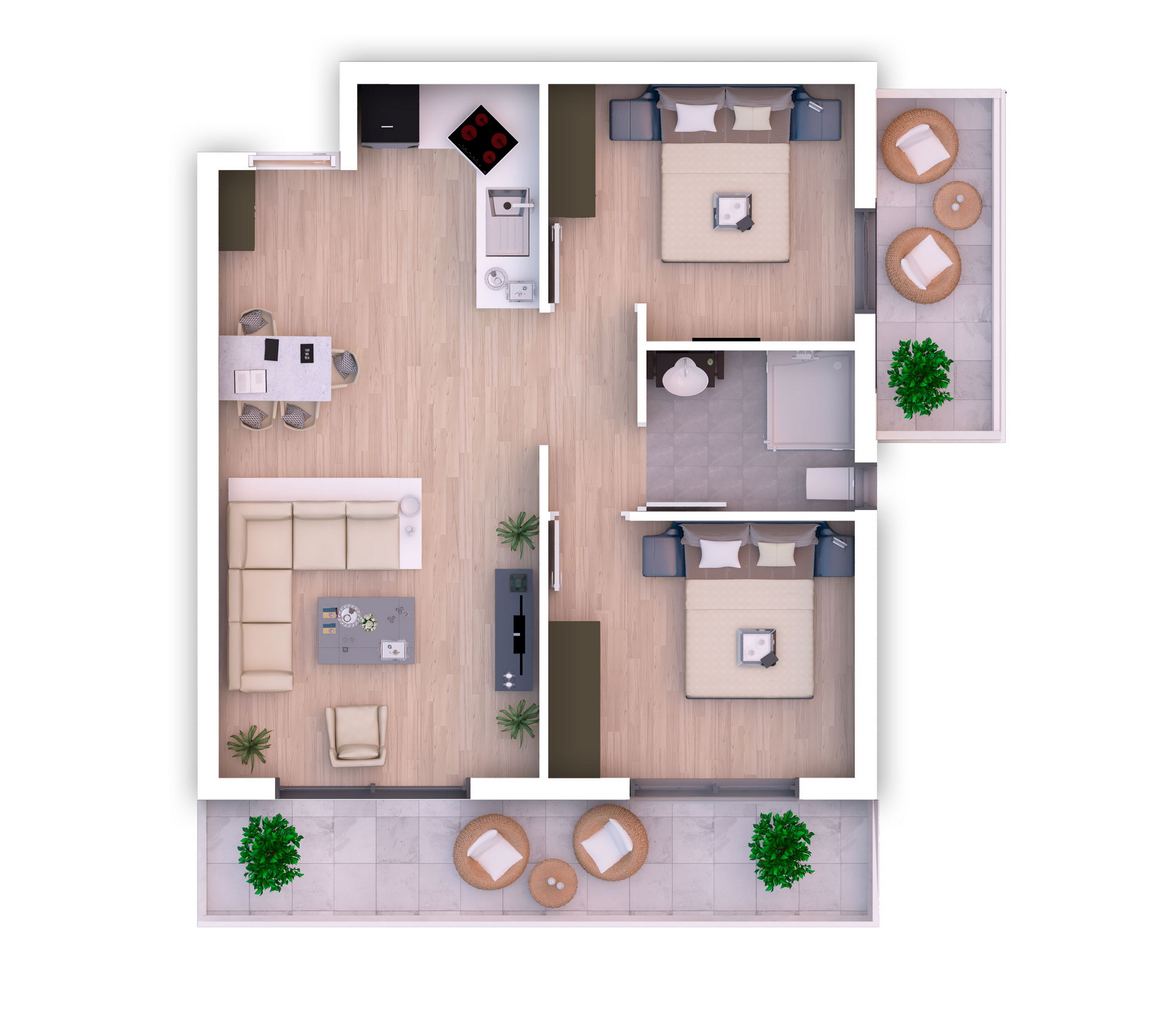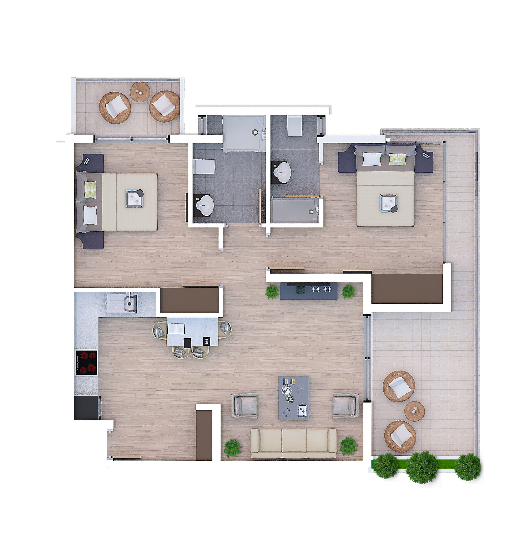 This apartment is available in several variations: 2+1 Family, 2+1 Premier, 2+1 Infinity. They differ slightly in footage, as well as the location of the balconies.